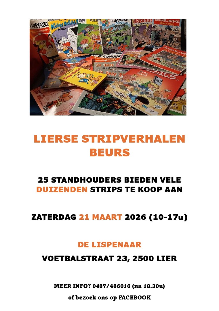Want op zaterdag 21 maart organiseren wij voor jong en oud een mooie beurs van stripverhalen in Lier. Beide zalen van De Lispenaar zullen volstaan met een 25-tal standhouders die een enorme keuze aan stripverhalen aanbieden. De Lispenaar is gelegen in de Voetbalstraat 23 in 2500 Lier (België), dat is tegenover de hoofdinkom van het grote voetbalstadion. Een grote gratis parking, gelegen aan dat voetbalstadion, is beschikbaar.